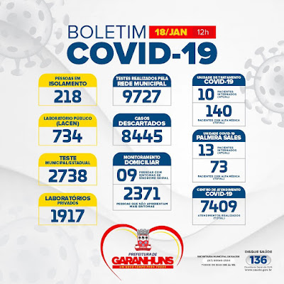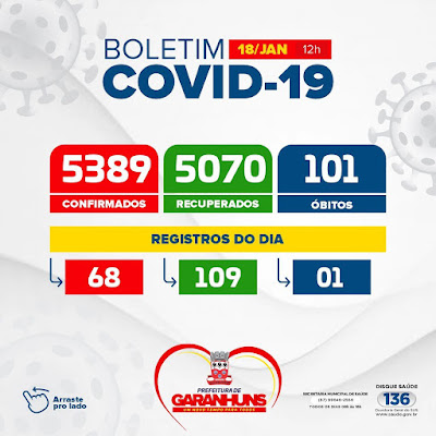 5.389 casos de COVID-19 em Garanhuns. Deste total, 101 pessoas vieram a óbito; 5.070