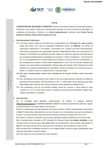 vagas em Cursos Técnicos de Nível Médio, na modalidade de Educação a Distância