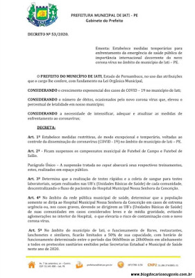 Município. Dentre as ações anunciadas, Tonho de Lula suspendeu os Campeonatos Municipais