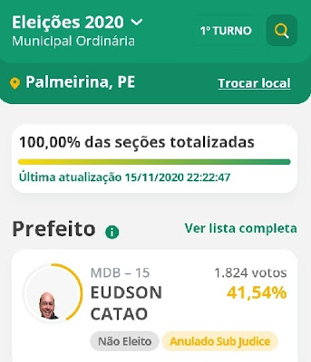 Eudson Catão foi o mais votado em Palmeirina nas eleições do último dia 15 de novembro, porém sua performace nas urnas ainda segue Sub Judice. Ele obteve