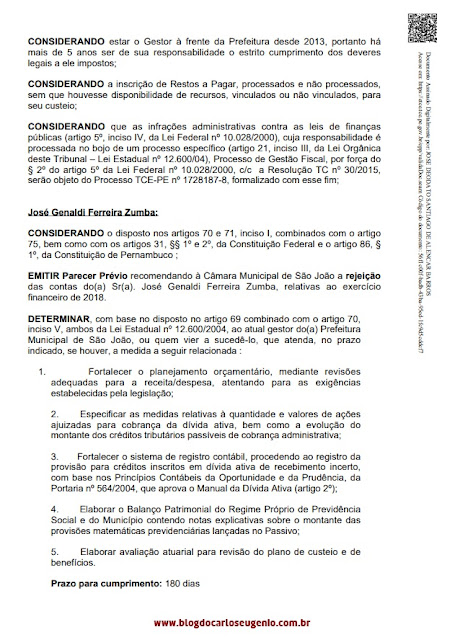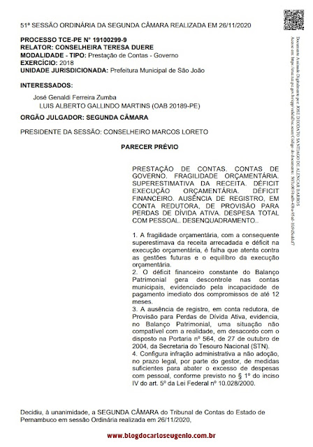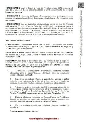 Municipal de São João a rejeição das contas do Prefeito Genaldi Zumba (PSD),