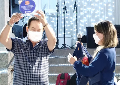 de uma placa simbólica e da camisa oficial da Magia do Natal 2020 como reconhecimento