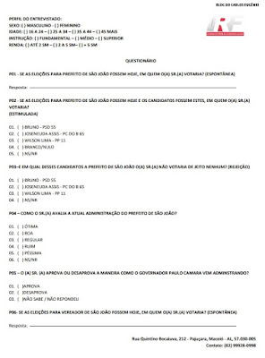 dias para as Eleições. O Estudo que estará em campo nessa segunda-feira, dia 2, e que prevê entrevistar 600 eleitores nos bairros, nos povoados e na zona rural de São João, foi registrado com o número PE-08663/2020, tendo sido contratado por R$ 6 mil