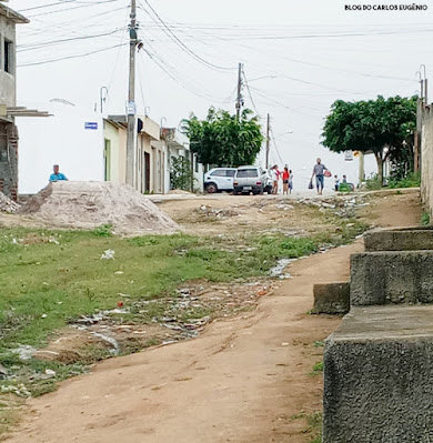 corre a céu aberto no meio da Travessa. A localidade ainda apresenta mato, buracos,