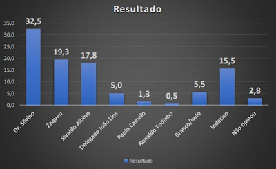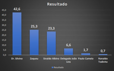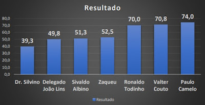 14,3%; Zaqueu com 12,3%; Delegado João Lins com 2,3% e Paulo Camelo com 1,3%.
