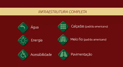 a partir de 250 Metros quadrados; Água; Energia; Calçadas padrão americano; Pavimentação;