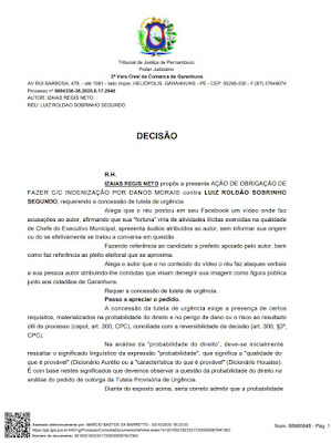 Indenização por danos morais impetrada por Izaías Régis consta a informação “que o réu postou em seu