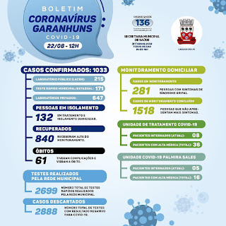 1.033 casos de COVID-19 em Garanhuns. Deste total 61 pessoas vieram a óbito; 840