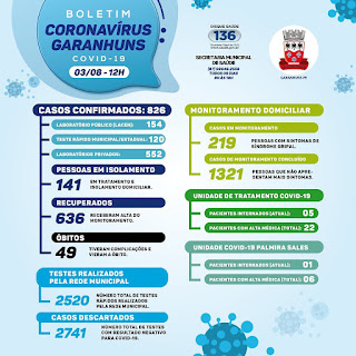 Ao todo, já foram confirmados793 casos de COVID-19 em Garanhuns. Deste total 49 pessoas vieram a óbito; 610