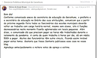 Blog e a outros veículos de comunicação da Cidade, via e-mail, uma denúncia acerca