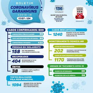 600 casos de COVID-19 em Garanhuns. Deste total 38 pessoas vieram a óbito; 404