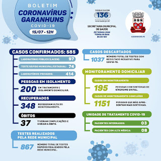 585 casos de COVID-19 em Garanhuns. Deste total 37 pessoas vieram a óbito; 348