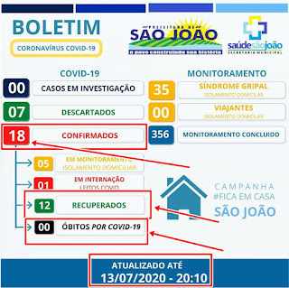 de São João registrou 18 casos da COVID-19, desses 12 já estão recuperados da