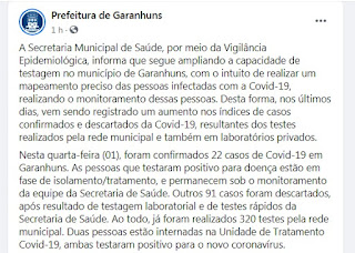 foram realizados 320 testes pela rede municipal”, registrou a Secretaria
