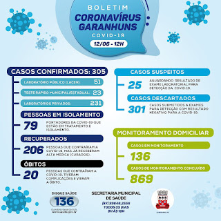 informou que nesta sexta-feira, dia 12, foram confirmados 12 casos para COVID-19