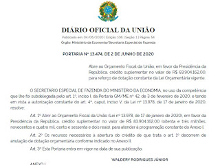 nessa quinta, dia 4, abrindo um crédito suplementar de R$ 83 milhões para