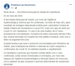 de casos suspeitos e confirmados da COVID-19, uma mulher de 52 anos foi sepultada
