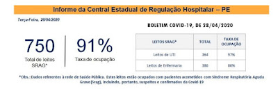 CASOS DO NOVO CORONAVÍRUS EM PERNAMBUCO – Nessa terça-feira, dia 28, a Secretaria Estadual de Saúde de Pernambuco (SES-PE) confirmou, através de boletim, 366 novos casos do Novo Coronavírus. Deste número, 196 casos se enquadram como Síndrome Respiratória Aguda Grave (Srag) e 170 se enquadram em casos leves. Com isso, o Estado totaliza 5.724 infectados (3.884 casos graves e 1.840 casos leves). Laboratorialmente também foram confirmadas 58 novas mortes nas últimas 24 horas, totalizando 508 óbitos pela covid-19 no Estado. (Com informações de Amanda Azevedo/JC. CONFIRA)
