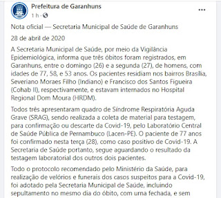 Secretaria de Saúde de Garanhuns também informou em Nota distribuída à