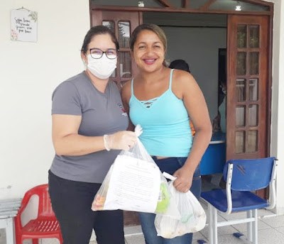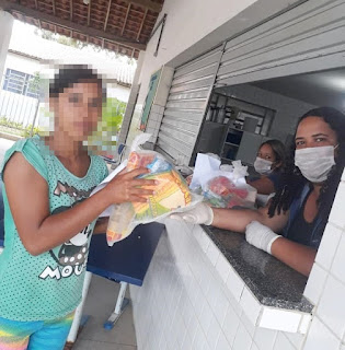 da equipe da secretaria de Educação realizando a distribuição de kits alimentícios