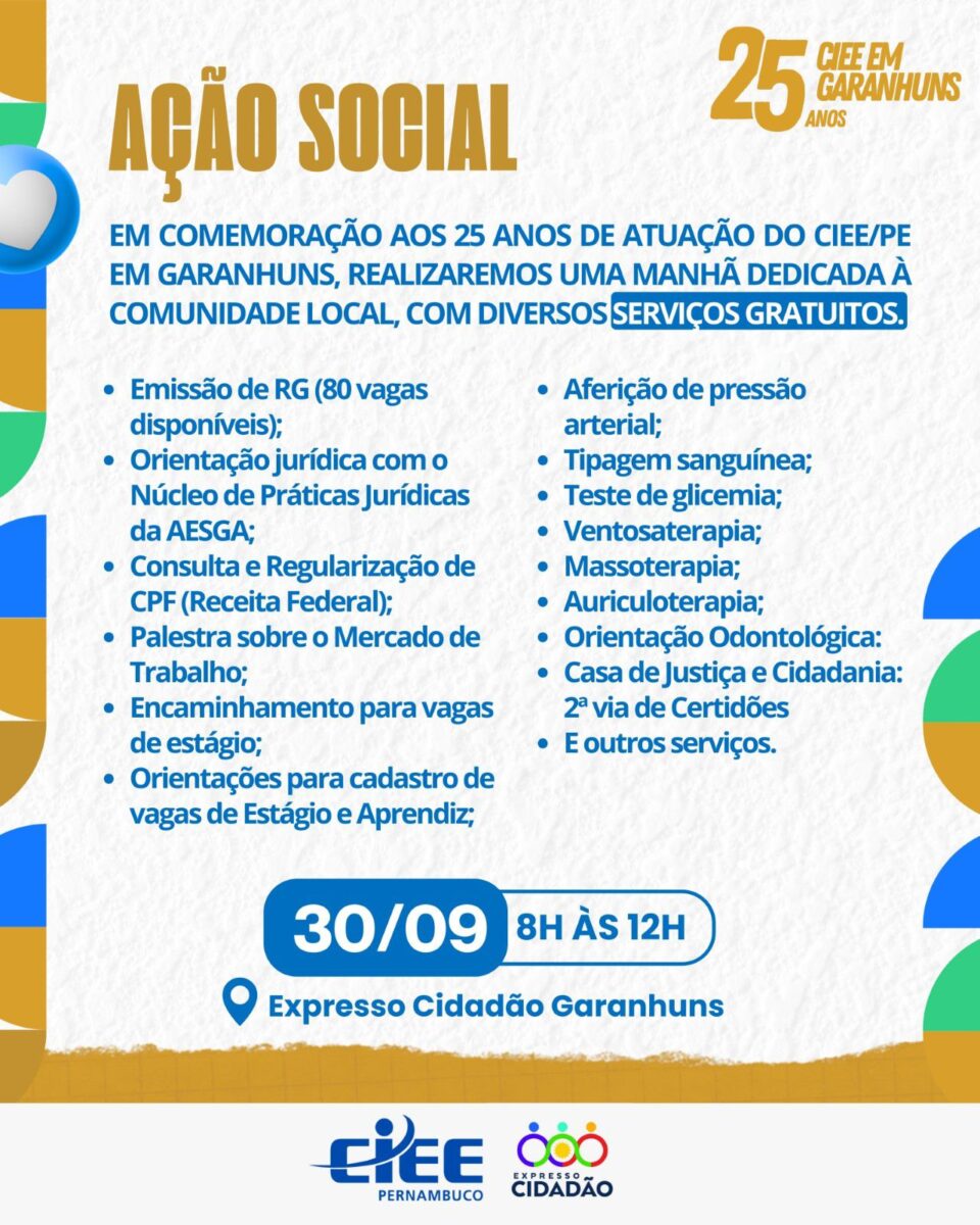 A população de Garanhuns vai contar na próxima terça-feira, dia 30, uma ação social em comemoração aos 25 anos de atuação do Centro de Integração Empresa-Escola de Pernambuco (CIEE-PE) na Cidade. O evento acontece no Expresso Cidadão, das 8 às 12h, e oferecerá diversos serviços gratuitos à Comunidade, por meio de parcerias com clínicas, faculdades e instituições locais.