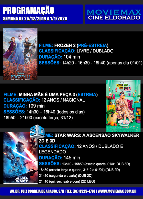 traz as estreias de ‘Frozen 2’ e ‘Minha Mãe é uma Peça 3’, além de manter em