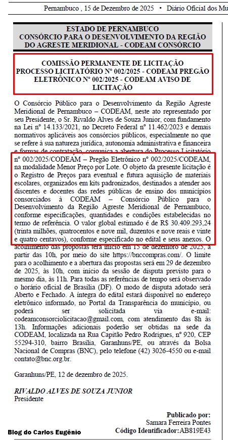 O Consórcio Público para o Desenvolvimento da Região Agreste Meridional de Pernambuco (CODEAM) abriu o Processo Licitatório (Pregão Eletrônico nº 002/2025) com o objetivo de registrar preços para a eventual e futura aquisição de materiais escolares organizados em kits padronizados.