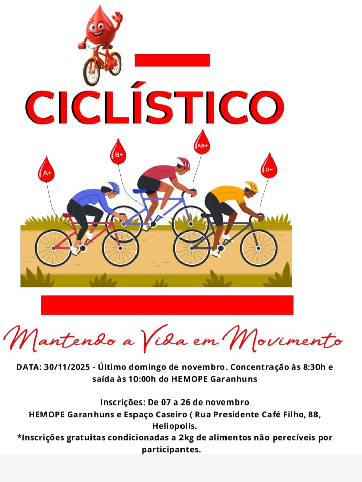 Com o objetivo de incentivar a doação de sangue e de medula óssea, a Equipe Colinas Bike, em parceria com o Hemope Garanhuns, promoverá no próximo dia 30 de novembro, o evento “Passeio Ciclístico – Mantendo a Vida em Movimento”. A iniciativa une esporte, solidariedade e conscientização em uma manhã de atividades abertas à população.