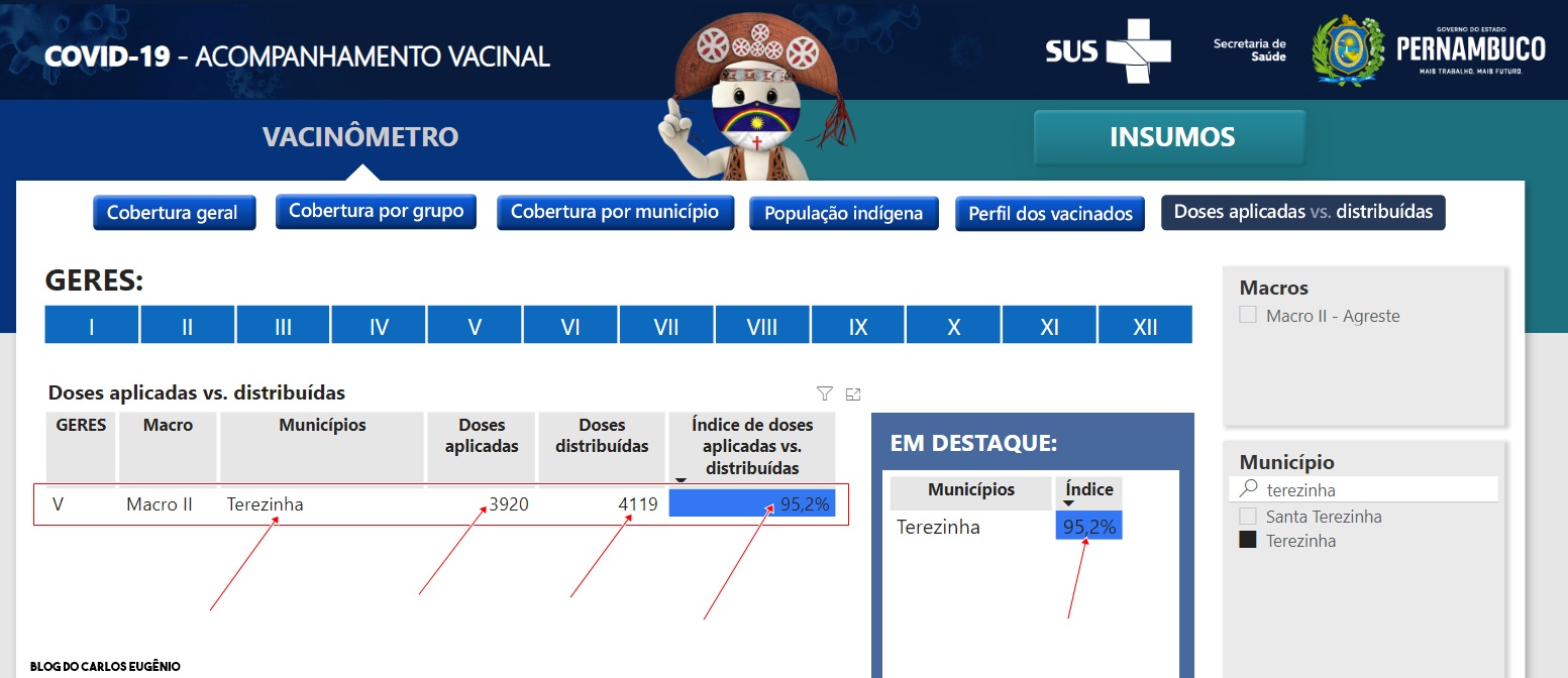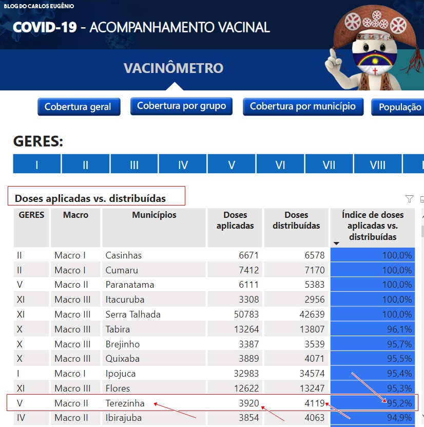 dá um percentual de 95,2% das doses distribuídas/aplicadas, colocando a cidade