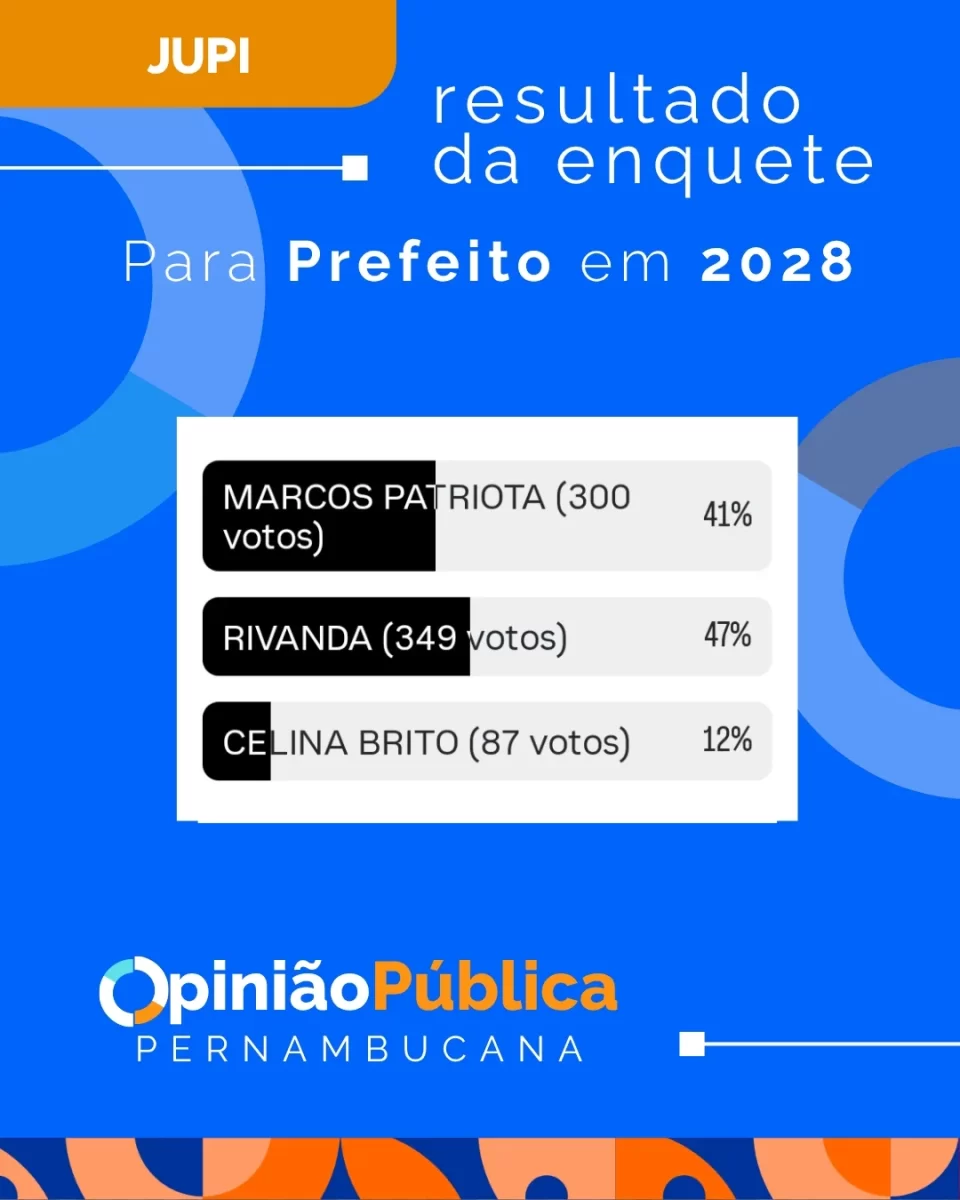 Realizada pelo perfil Opinião Pública Pernambucana, no Instagram, a sondagem envolveu pouco mais de 700 participantes e apontou Rivanda Freire na liderança, com 47% dos votos (349 votos), seguida pelo Ex-prefeito Marcos Patriota, com 41% (300 votos), e pela Ex-prefeita Celina Brito, que obteve 12% (87 votos).