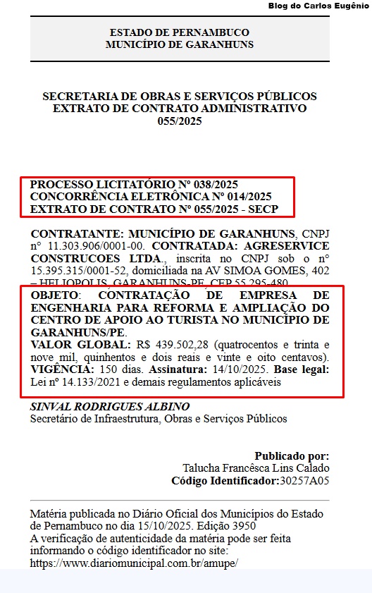 De acordo com o extrato do Contrato nº 055/2025, publicado no Diário Oficial dos Municípios de Pernambuco nesta quarta-feira, dia 15, a Empresa foi contratada através da Concorrência Eletrônica nº 014/2025, vinculada ao Processo Licitatório nº 038/2025. O documento foi assinado nesse dia 14, pelo secretário de Infraestrutura, Obras e Serviços Públicos, Fá Albino.