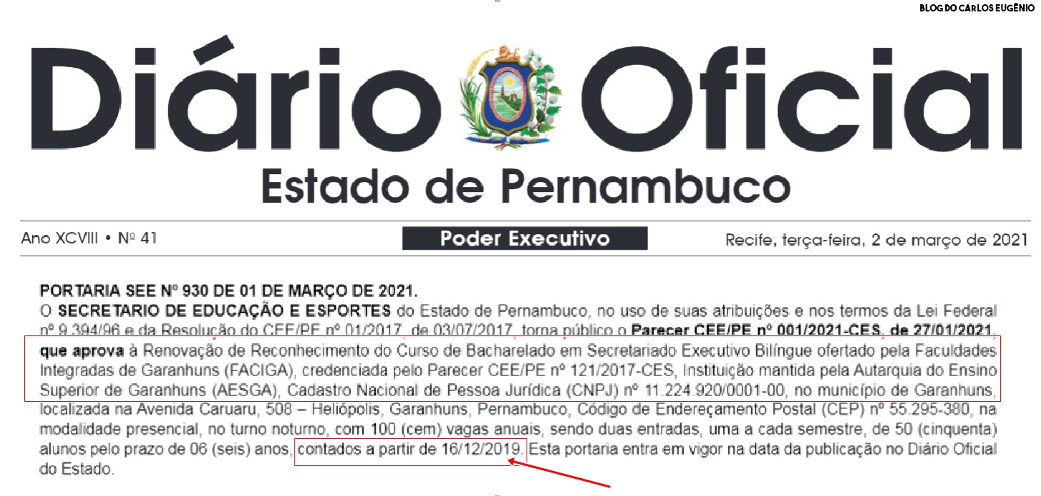 CEE/PE nº 001/2021-CES, de 27/01/2021, o Curso teve o reconhecimento renovado