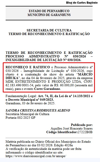 TRANSPARÊNCIA – E a Secretaria de Cultura divulgou o valor da contratação do show de Márcio Dhuka, realizado no último dia 4, dentro da programação da Corre Garanhuns. A apresentação custou R$ 60 mil, e foi viabilizada via inexigibilidade de licitação. O show de Pedro Vinicius ainda não teve o valor divulgado. (@blogcarloseugenio, com imagens de Wedson Gonçalves e Geraldo Mendonça/PMG).
