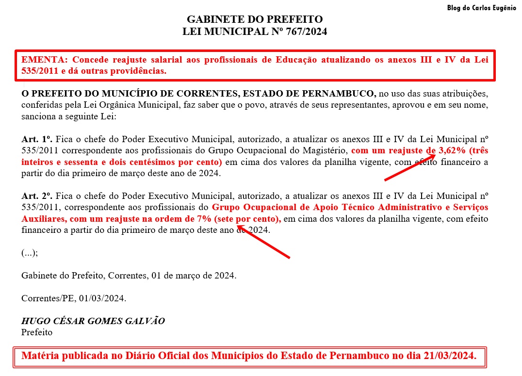 A Prefeitura de Correntes concedeu reajuste salarial aos Profissionais de Educação daquele Município. O Diário Oficial dos Municípios de hoje, dia 21, traz a publicação da Lei Municipal nº 767/2024, com um reajuste de 3,62% e efeitos financeiros retroativos a partir do dia 1º de março. Ainda no Agreste Meridional, as prefeituras de Paranatama, Iati, Brejão, Caetés, Saloá e Lajedo também já concederam o reajuste, que pela Lei deve ser retroativo a 1ª de janeiro.