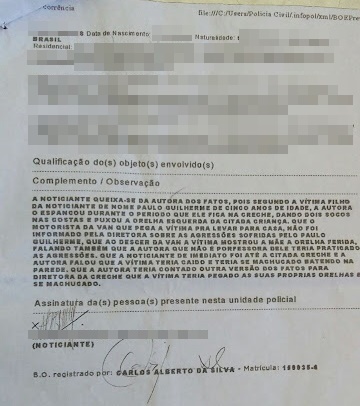 que afirmou em Boletim de Ocorrências, registrado na Delegacia, que o filho teria sido agredido com