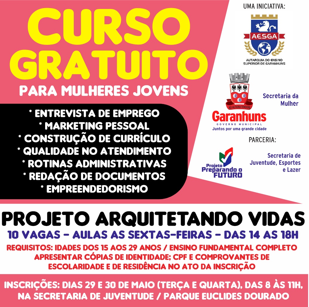 Garanhuns, o projeto Arquitetando Vidas vai oferecer vagas em curso de Empoderamento