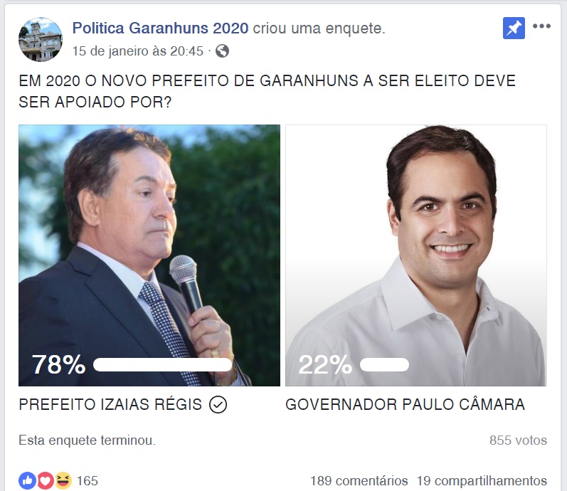 Enquete promovida pela página do facebook Política Garanhuns 2020, editando um possível embate entre os candidatos apoiados pelo Prefeito Izaías