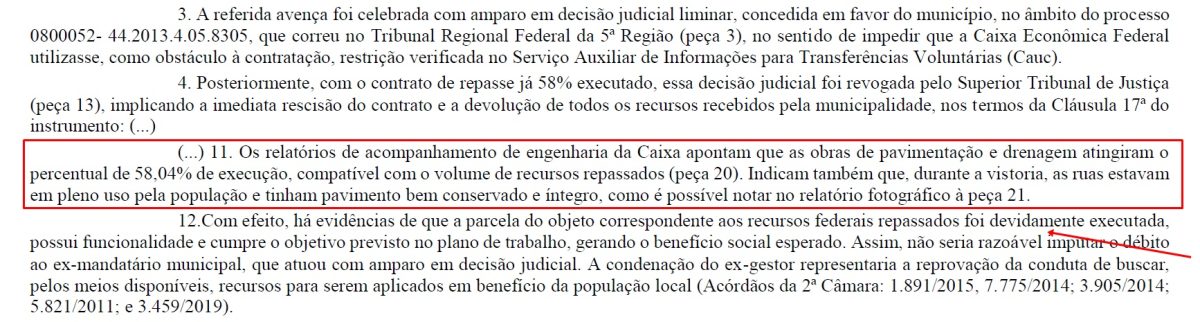 Ainda segundo os Advogados do Ex-prefeito, os relatórios técnicos também apontaram que as obras realizadas estavam “em pleno uso pela população e em boas condições”, evidenciando, segundo a defesa de Régis, “a correta aplicação dos recursos públicos na execução parcial do Projeto”. Ainda de acordo com a defesa de Izaías, “parte dos valores não utilizados foi devidamente devolvida”.