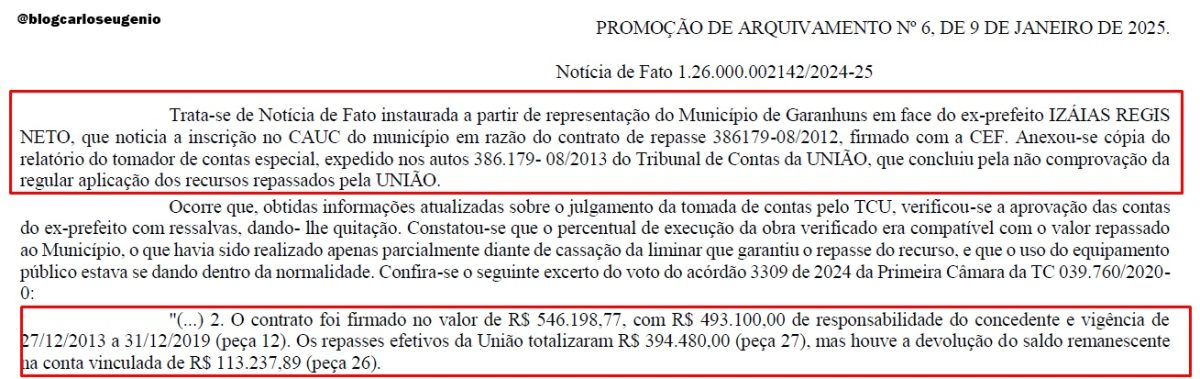 “Ainda segundo o TCU, não houve desvio de recursos nem prejuízo ao erário, motivo pelo qual as contas do então Gestor foram aprovadas com ressalvas e com quitação. Com base nesse entendimento, o Ministério Público Federal concluiu que não houve dolo, ato de improbidade administrativa ou prática criminosa, formalizando o arquivamento do caso”, complementou a assessoria jurídica de Izaías.