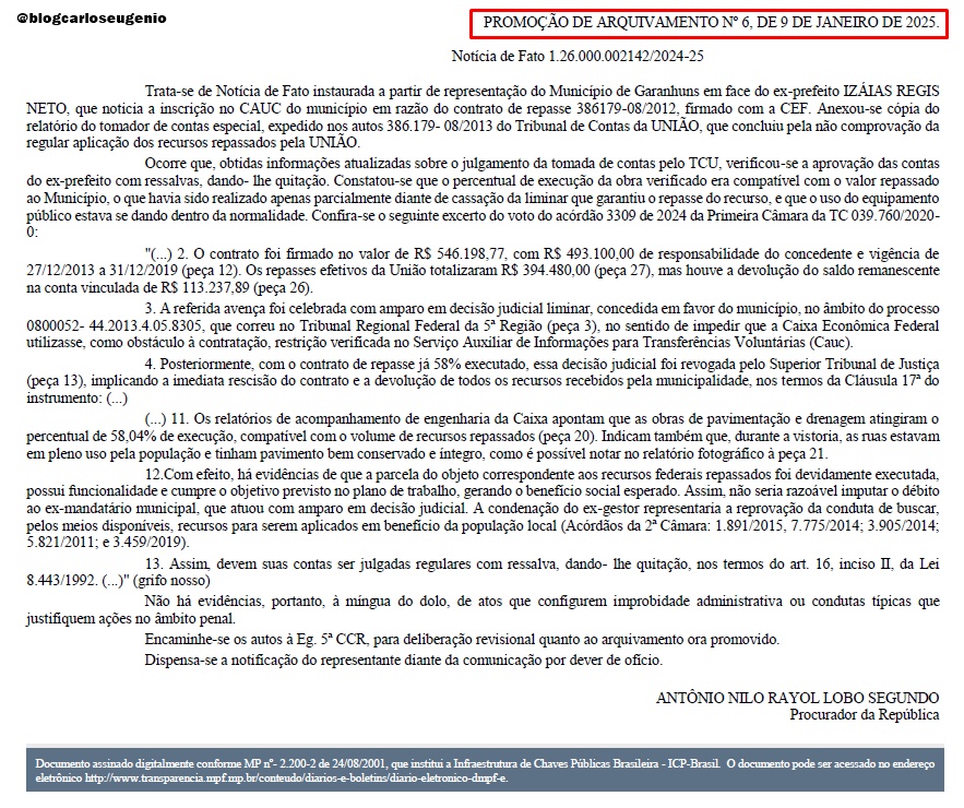 “Temos a plena convicção na reversão da decisão nas instâncias superiores”, registra trecho do texto enviado ao Blog do Carlos Eugênio pelos advogados de Izaías Régis. A posição foi ratificada pelo Ex-prefeito. “Estou tranquilo quanto ao restabelecimento da verdade dos fatos. Também reforço minha confiança na Justiça e reitero meu compromisso com a transparência, a legalidade e o respeito aos recursos públicos”. Baixe o Arquivamento clicando AQUI e buscando na Página 31. (@blogcarloseugenio)