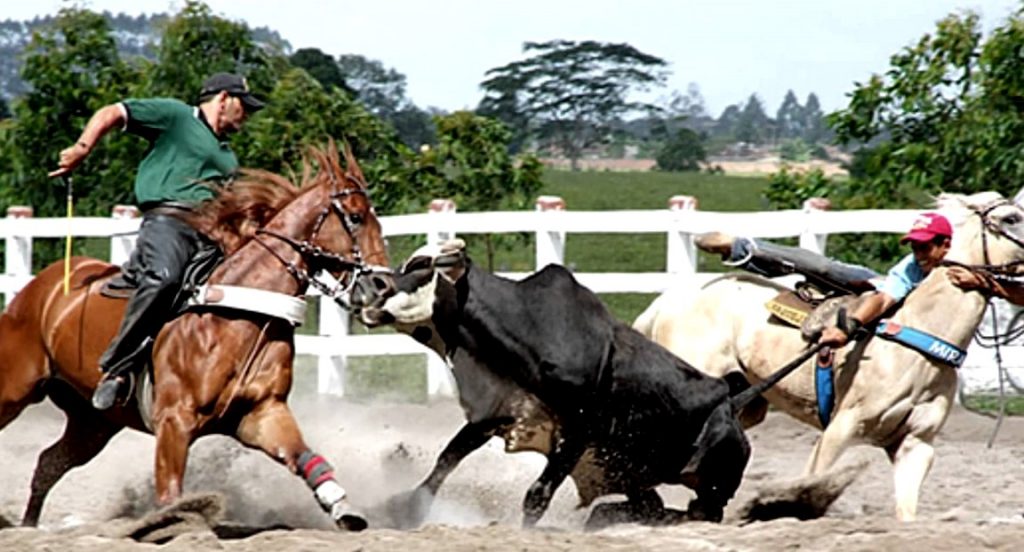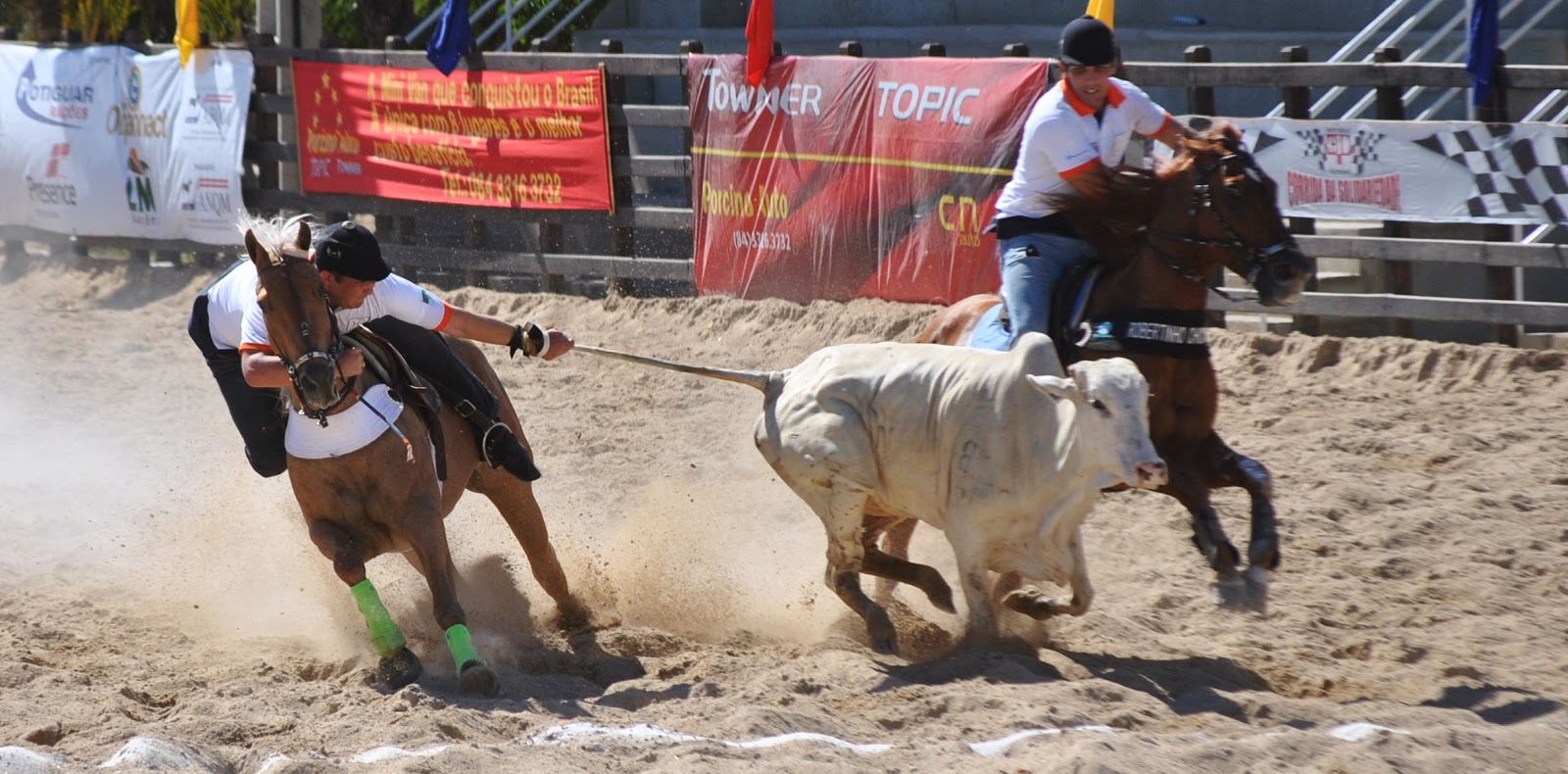 os vaqueiros tem como objetivo derrubar o boi puxando o animal pelo rabo. Em