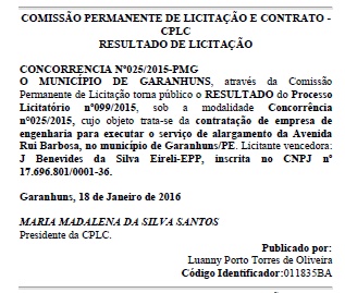 sob a modalidade Concorrência n° 025/2015 e executará os Serviços. O Governo Municipal