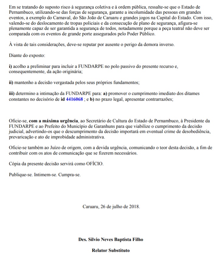 cumprir a decisão do Desembargador Silvio Neves Baptista Filho e o espetáculo “O Evangelho Segundo Jesus