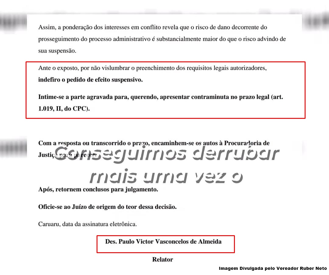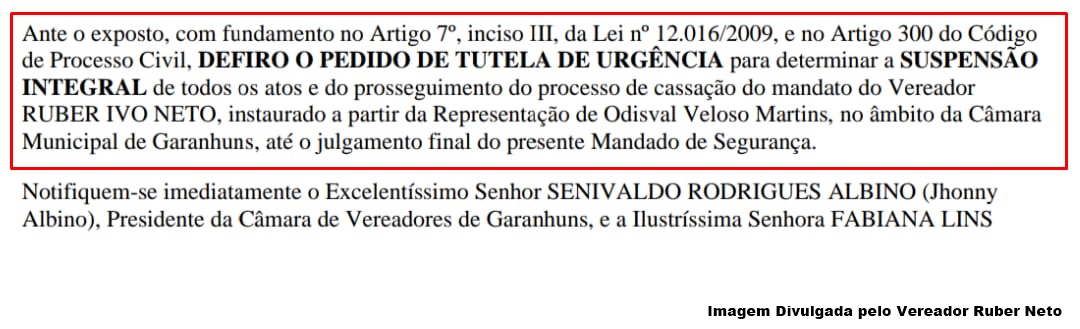 O vereador Ruber Neto (PSD) divulgou a informação que a liminar suspendendo integralmente o processo de cassação do mandato dele na Câmara Municipal de Garanhuns foi mantida em segunda instância pelo Desembargador Paulo Victor Vasconcelos de Almeida, relator da Ação na Segunda Turma da Câmara Regional de Caruaru (2ª TCRC).