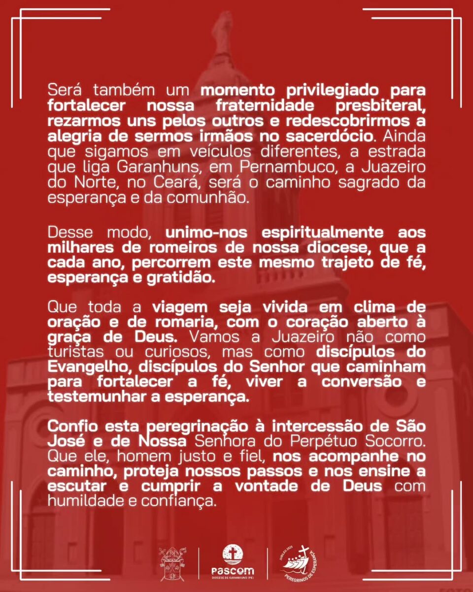 Inspirados pelo testemunho do Servo de Deus Padre Cícero Romão Batista, os sacerdotes de Garanhuns buscarão viver este momento como uma verdadeira experiência espiritual. A proposta é que a viagem seja marcada pela oração, pela fraternidade e pelo encontro com Deus.