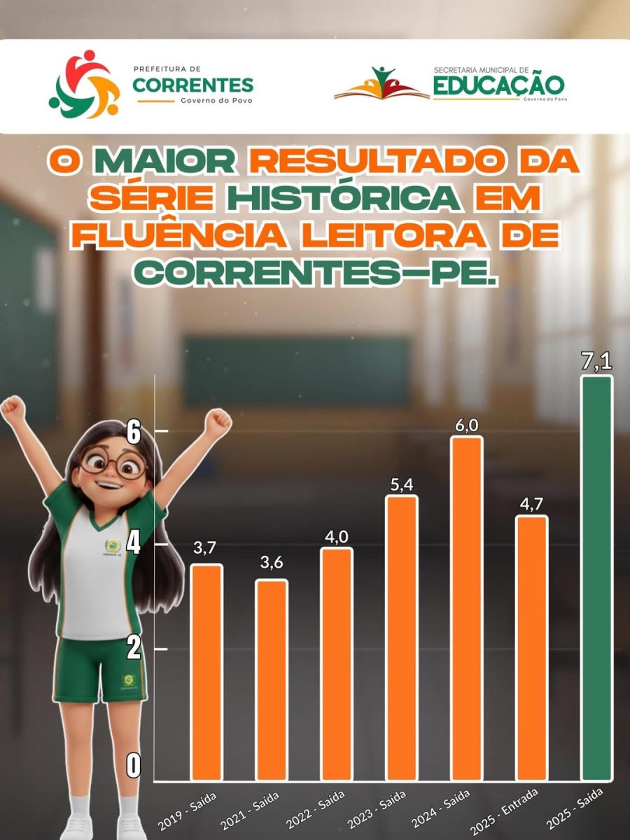 A Educação do município de Correntes alcançou, em 2025, o melhor desempenho de sua série histórica em Fluência Leitora, figurando também entre os maiores índices do Agreste Pernambucano. A informação é da assessoria do Governo Correntino, e registra que “o resultado consolida o avanço do Município na Alfabetização na idade certa”.