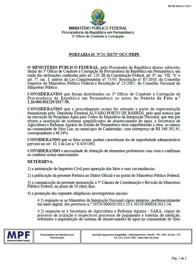 Ministério Público Federal determinou a abertura de inquérito civil para