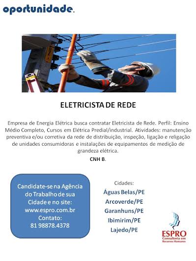 Consultoria em Recursos Humanos em parceria com a Celpe está selecionando Eletricistas