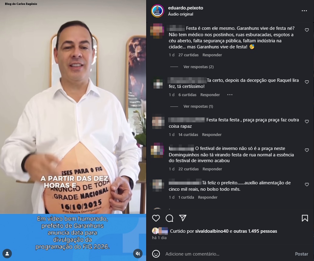 O ex-vereador Gil PM, que exerceu dois mandatos na Câmara Municipal de Garanhuns, criticou o Prefeito Sivaldo Albino (PSB) após a divulgação de um vídeo em que o Gestor, ao lado do filho dele, o deputado Estadual Cayo Albino (PSB), protagoniza uma peça publicitária em alusão a uma “gestação de nove meses” para anunciar a divulgação dos Artistas Nacionais que comporão a grade do Palco Principal da edição 2026 do Festival de Inverno de Garanhuns.