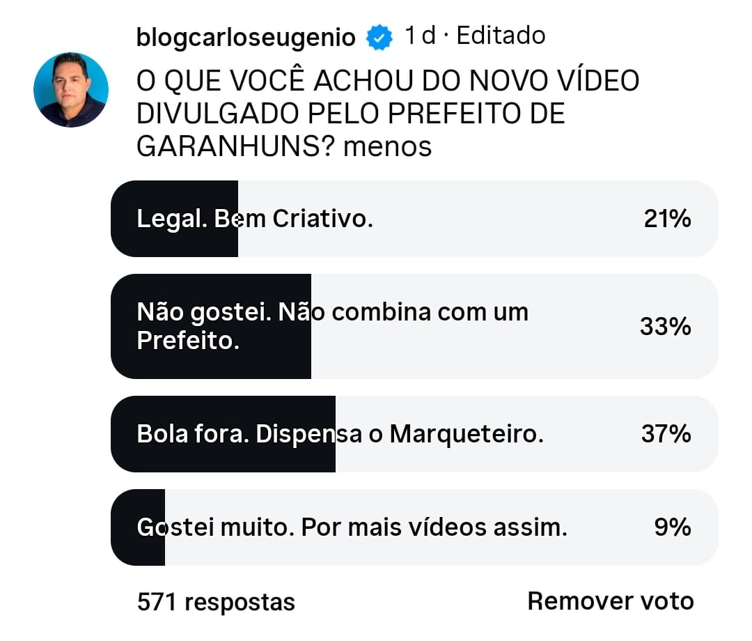 Dos 571 participantes, 37% classificaram o conteúdo como “Bola fora. Dispensa o marqueteiro”, enquanto 33% afirmaram que “Não combina com um Prefeito”. Outros 21% consideraram o material “Bem criativo” e 9% disseram ter “gostado muito”. A enquete já alcançou cerca de 50 mil visualizações até as 21h deste domingo, dia 12.
